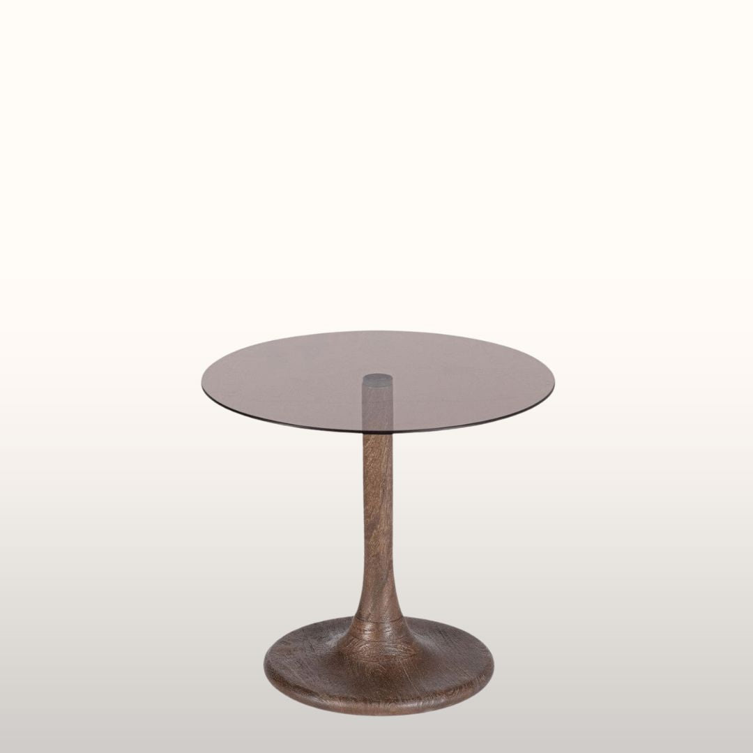 We are absolutely delighted with this little side table.  It has a beautifully moulded dark wooden base with a smooth finish and lovely curves.  This is topped with a dark brown smoked glass top and the overall effect is stylish and cool.  Just the sort of occasional side table that you need in a sitting room, kitchen or reading nook.
