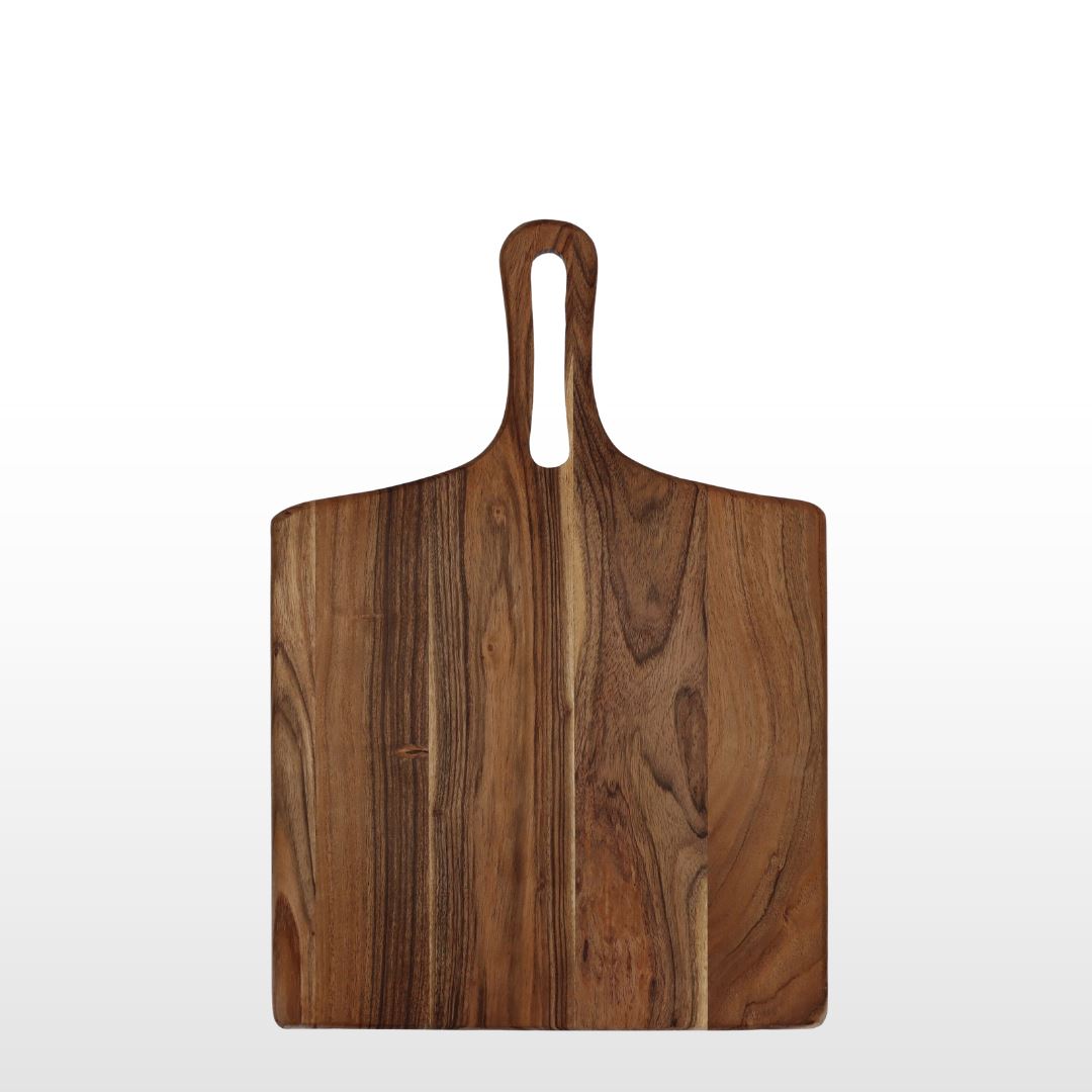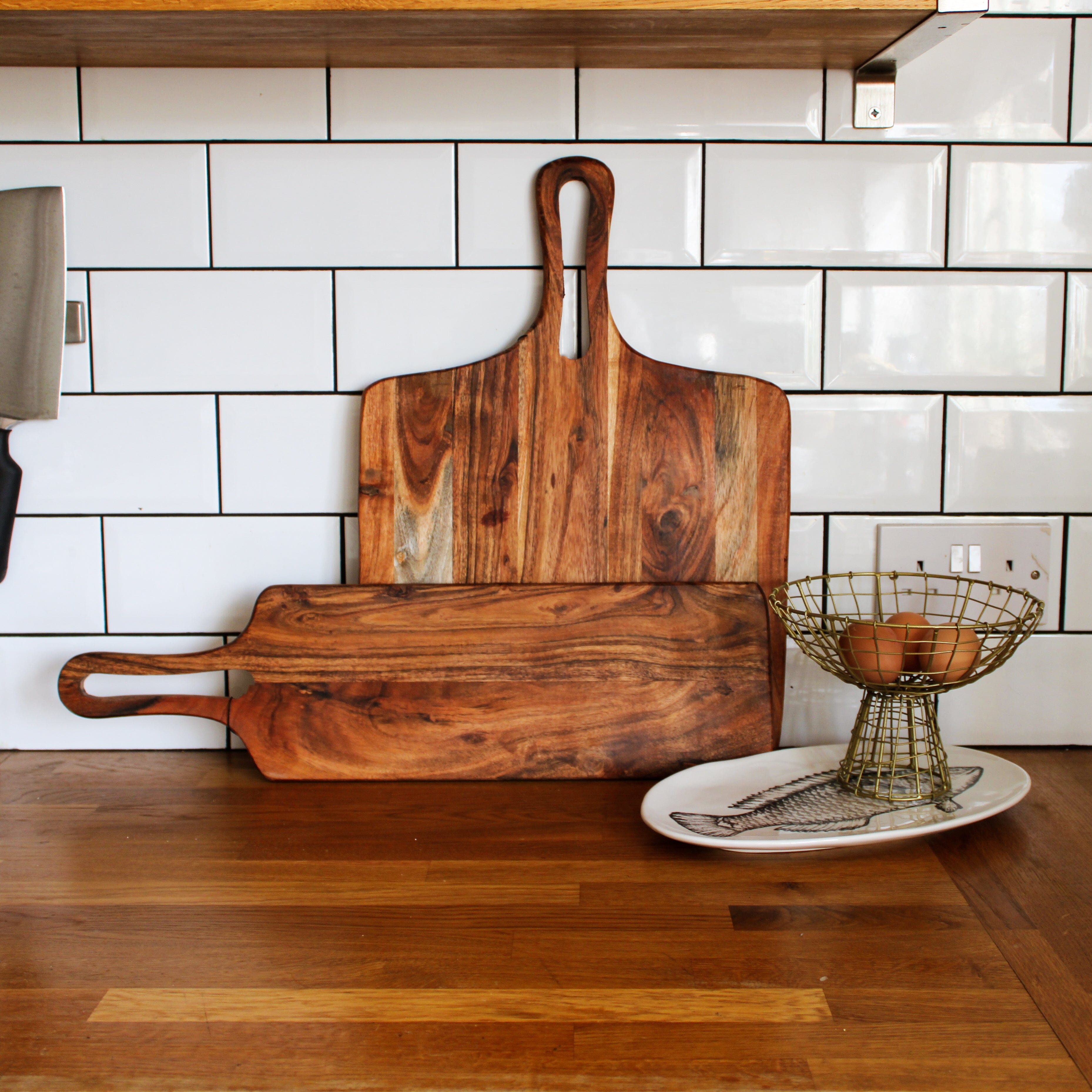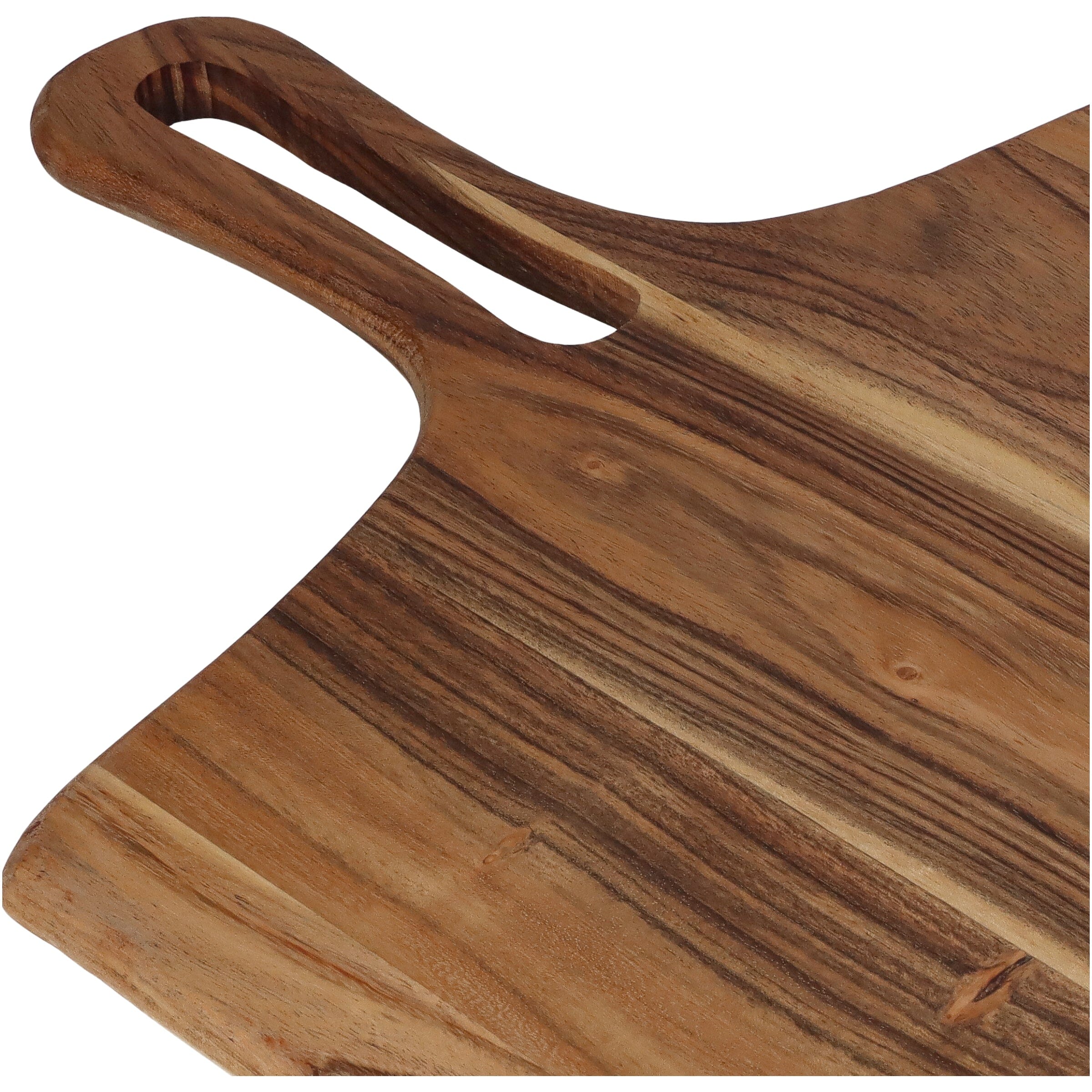 Cette large planche à découper en bois robuste est un incontournable de la cuisine à la mode et une vaisselle polyvalente. Le matériau en bois chaleureux est parfait pour les pizzas grésillantes, les repas d'été en plein air ou les plats faciles à servir pour organiser des dîners. Le long manche et la base large de la planche assurent une utilisation pratique et confortable. Nous aimons le grain distinct qui donne à cette pièce une sensation rustique et contraste avec ses magnifiques bords carrés arrondis et doux.