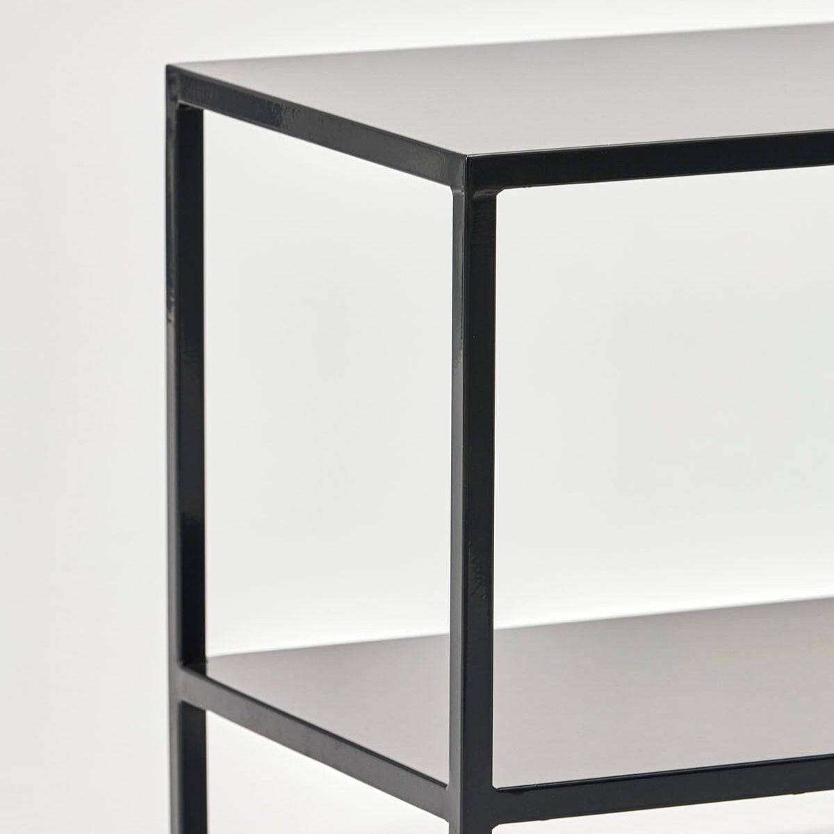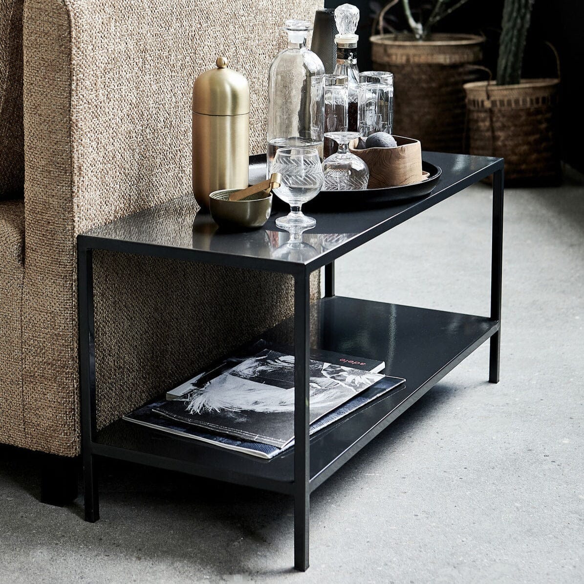 Experience classic elegance with our black metal rectangular coffee table. Its sleek, two-tiered design adds a modern touch to any living area, while the deep black metal and timeless styling keep your space looking sophisticated. The lower tier is perfect for storing magazines and books, making it the ideal small neat coffee table for your home. Measuring 85cm by 35cm, this coffee table is ideal for small apartments or smaller living rooms where you want to conserve floor space.