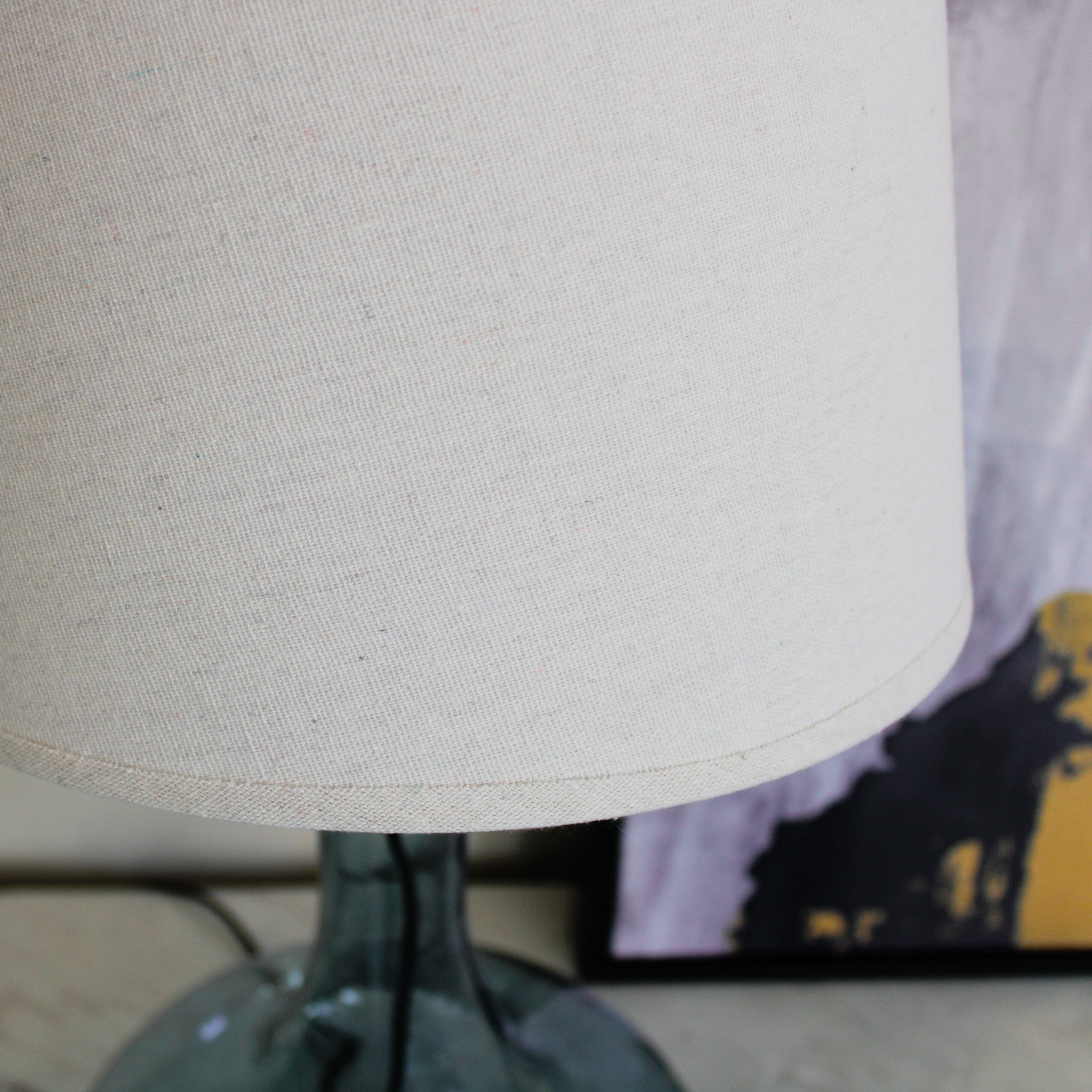 This gorgeous lamp is a small yet mighty piece to add to any tabletop or sideboard. It is a beautiful coloured glass lamp base with a chrome top. The shade of light blue glass is perfect for a subtle pop of colour in most colour schemes, we think pairing it with cool tones like white, navy and grey would make a bright and cheerful combination. The white cotton shade is a chic and neutral top to this little stunner!
