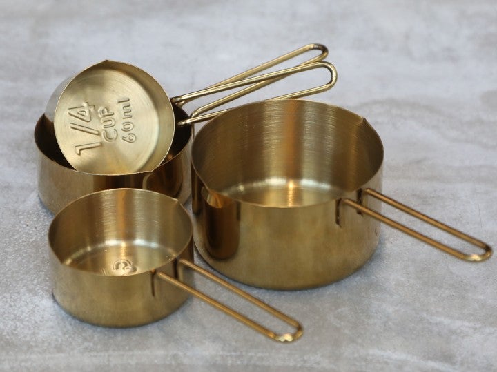 This set of multisized measuring cups will add a gleaming accent to the kitchen with their metallic gold finish. Perfectly formed in every way, every want to be baker should own a set of sturdy metal measuring cups. With conversions to millilitres, these measuring cups are as practical as they are beautiful.