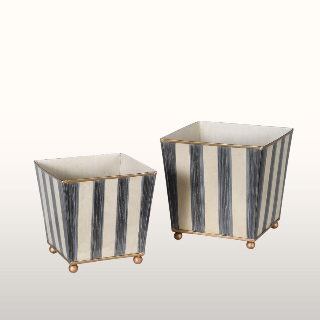 Enhance your indoor plant collection with our Grey Striped Tapered Planters, a stylish little pair of planters with balled brass feet. Perfect for displaying your houseplants, these striped planters will add a touch of sophistication to any shelf or corner. Elevate your home decor with these cute and on-trend planters.