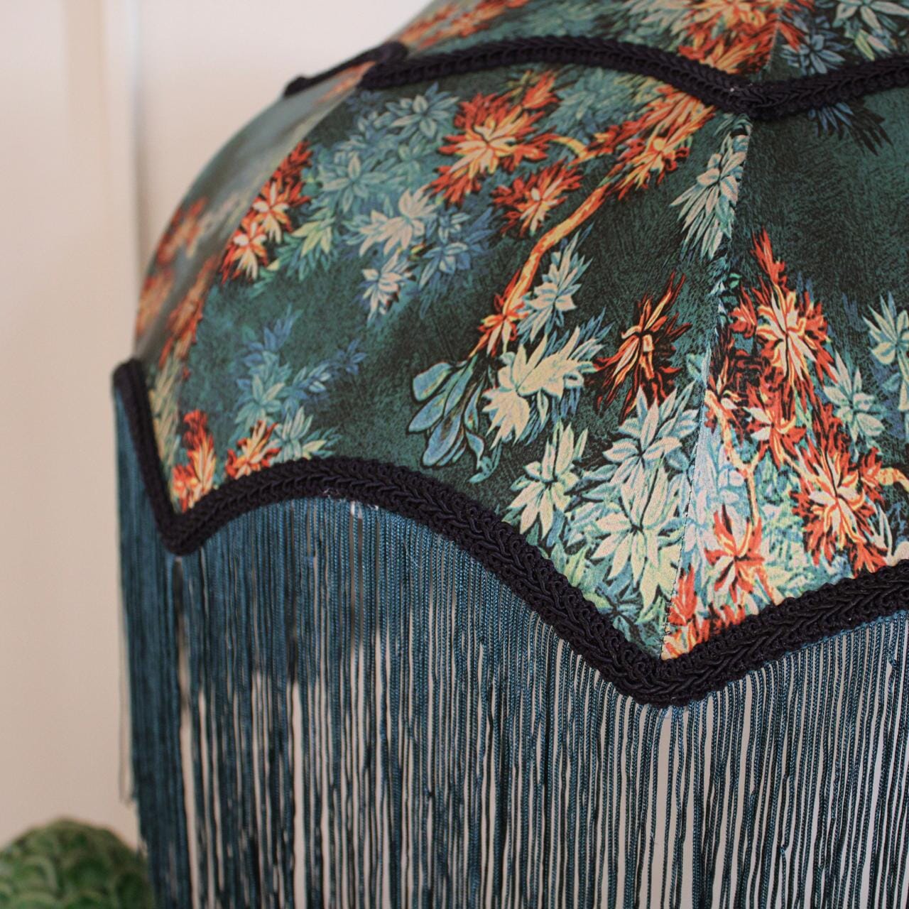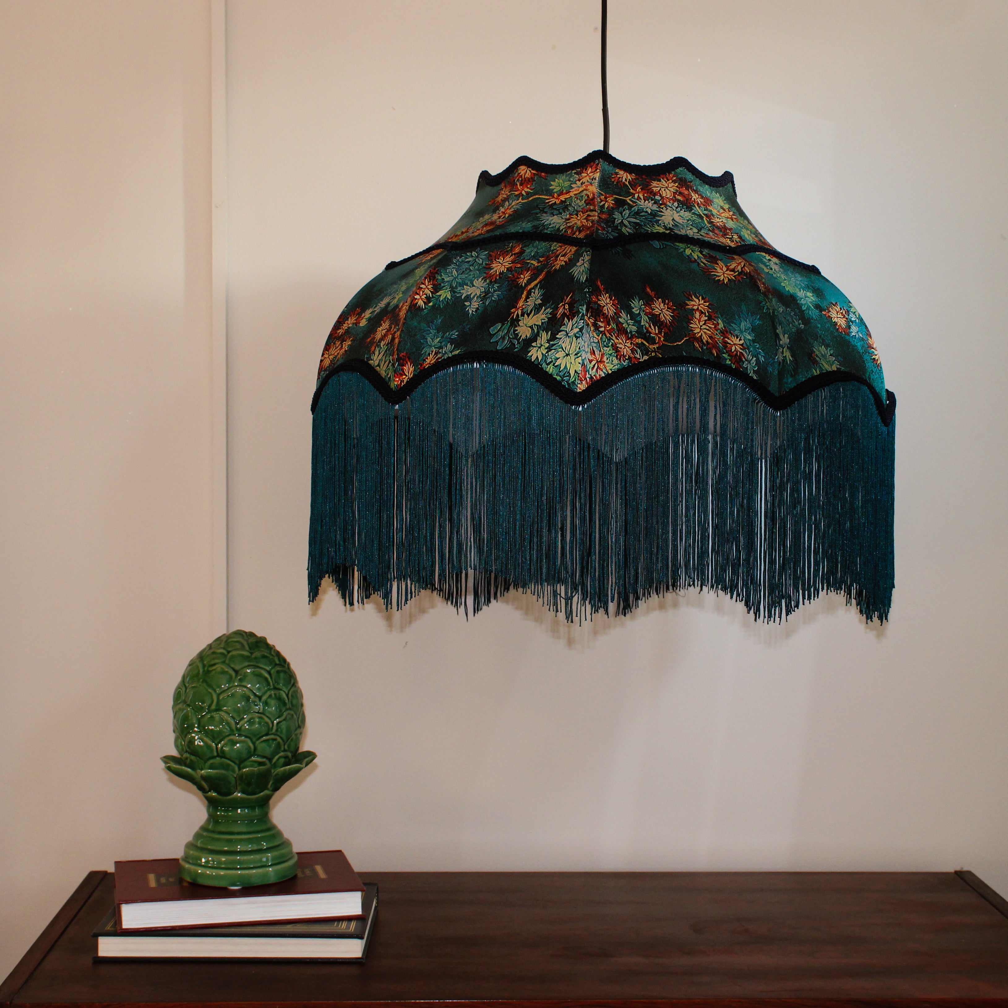 Fringed lampshades hold a special place in our hearts and this Large Floral Design Fringed Lampshade is no exception! The gorgeous teal colour and warm floral pattern evoke memories of oriental patterns, with a beautiful scalloped edge with navy fringe trim. It's rotund shape evokes old world glamour, and hangs beautifully on a pendant point but equally will work well on a lamp.