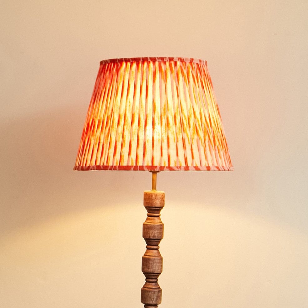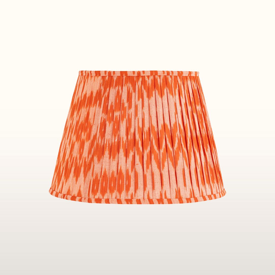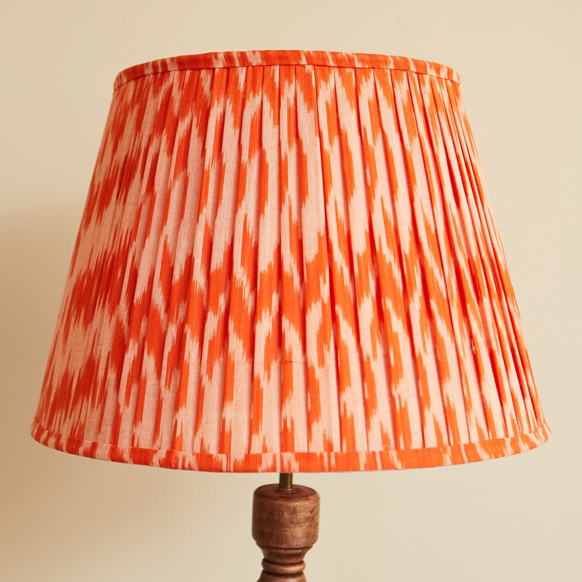 This is our signature orange pleated lampshade. Beautiful when lit giving a warm and inviting glow, this lampshade will work really well with large floor lamps or with a ceiling pendant. These shades have a gimbel enabling use with both mounted and hanging fittings. This lampshade is also available in a medium size which is better for a table lamp.