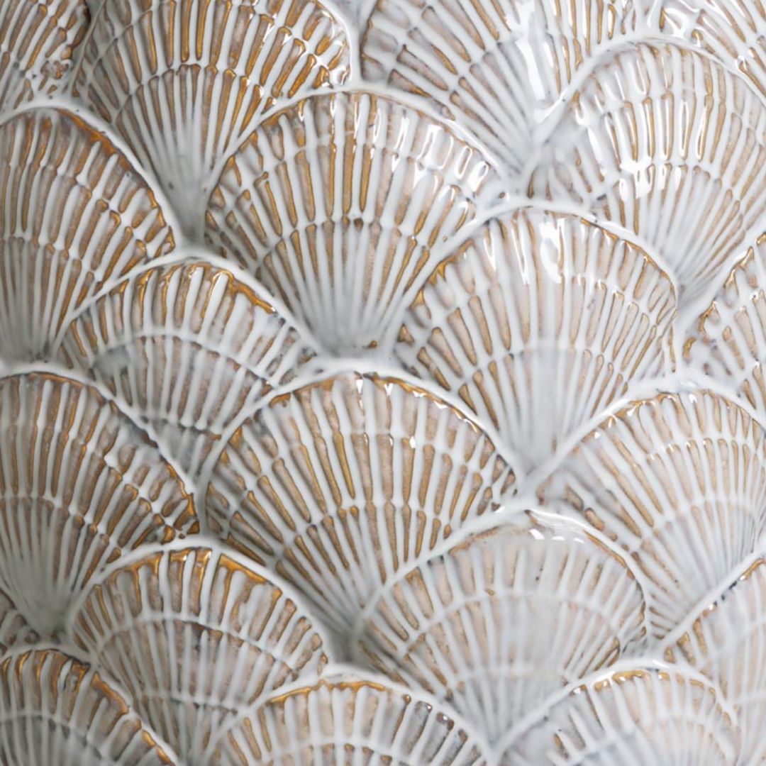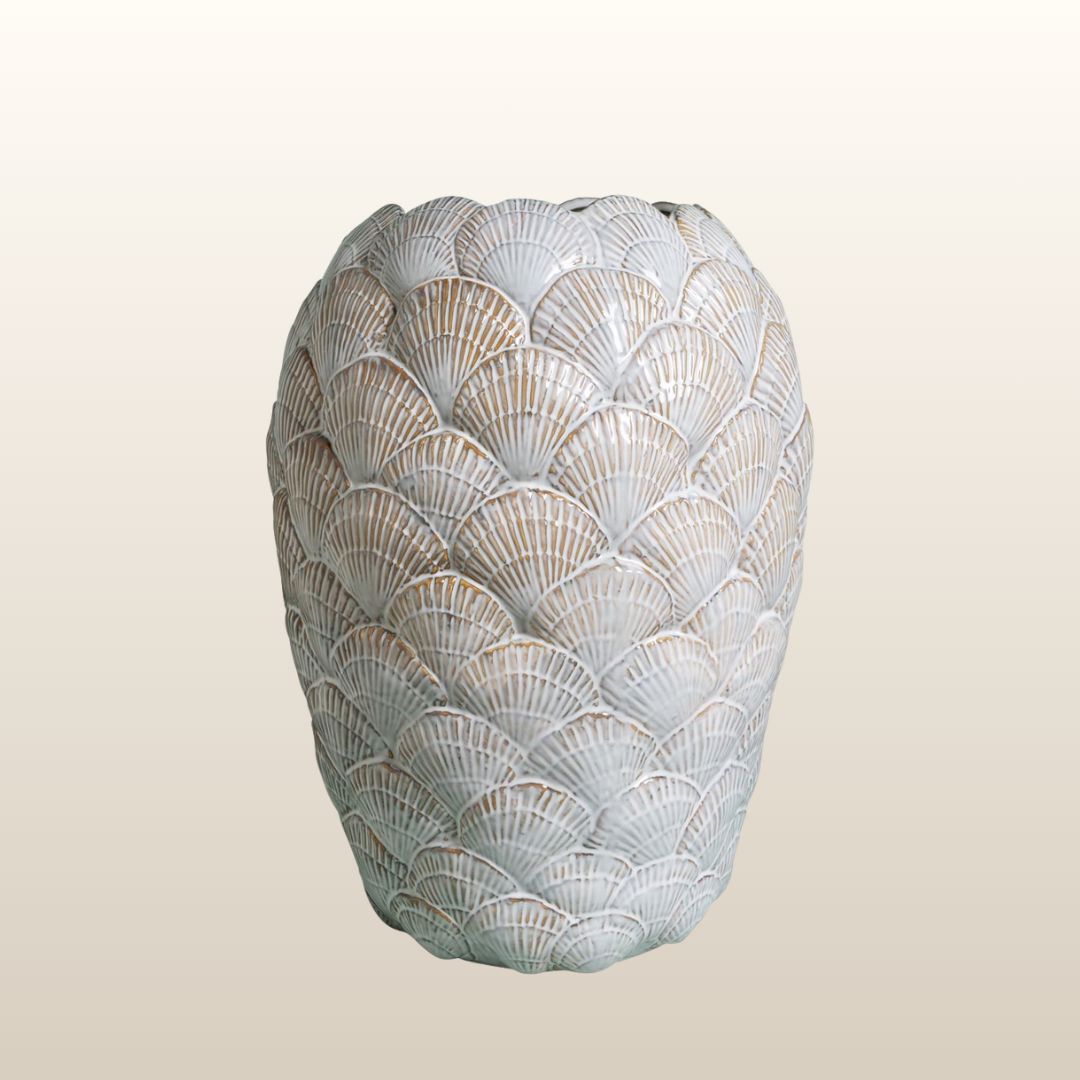 This large and impactful vase casts a very beautiful silhouette and is a gorgeous ornament in its own right let alone when filled with a stunning floral arrangement.  The overlapping shell design is harmonious and tactile to the touch which when combined with the size, gives this vase real presence.  The large shell vase would make an excellent gift for a friend or the perfect shaped object to add to a shelf display.