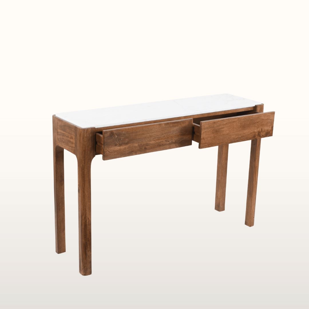 It has two deep drawers and a very fine slightly inlaid white marble top. At 125cm wide, this console table will sit behind sofas or in hallways and really hold it's own.