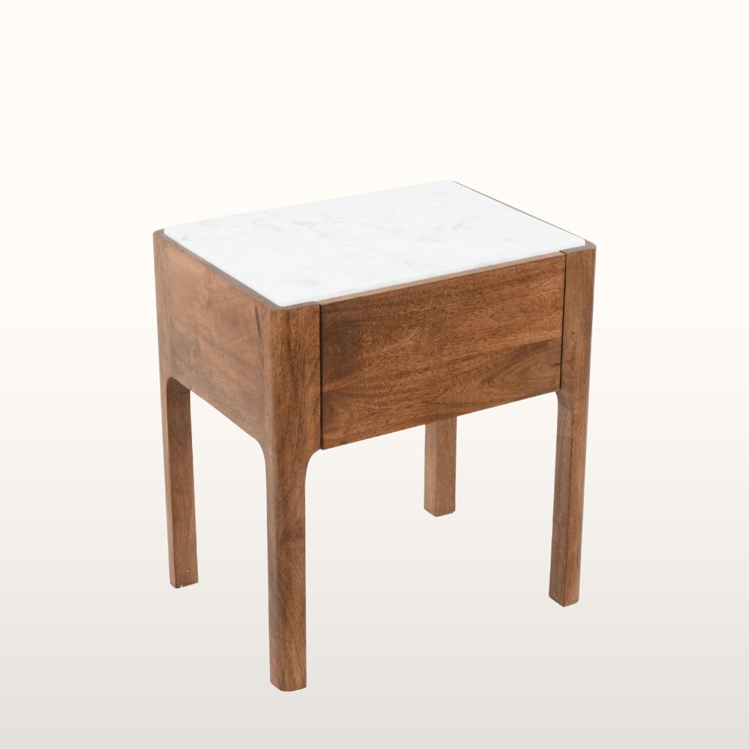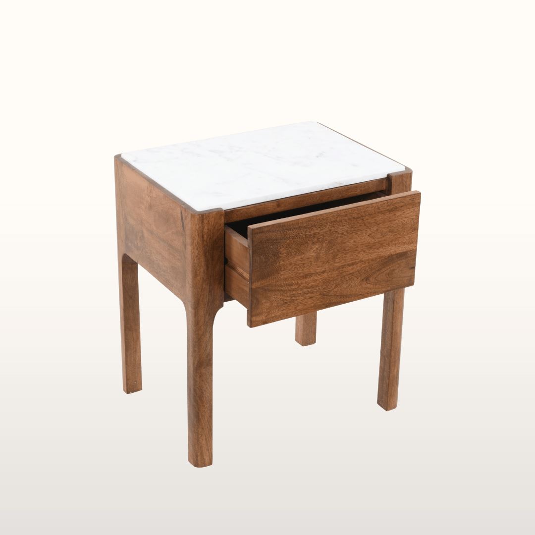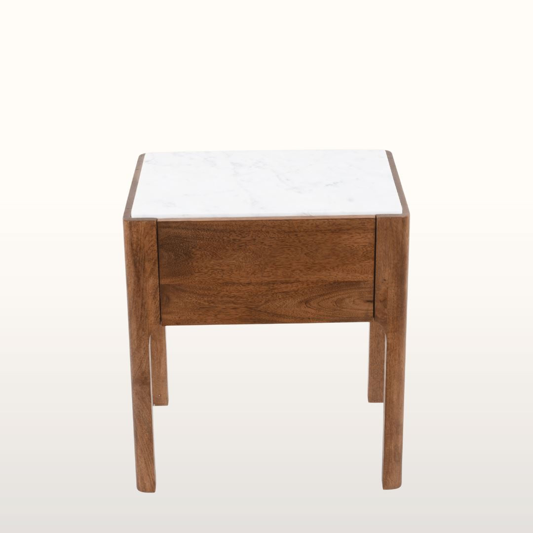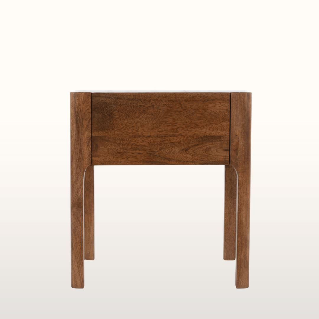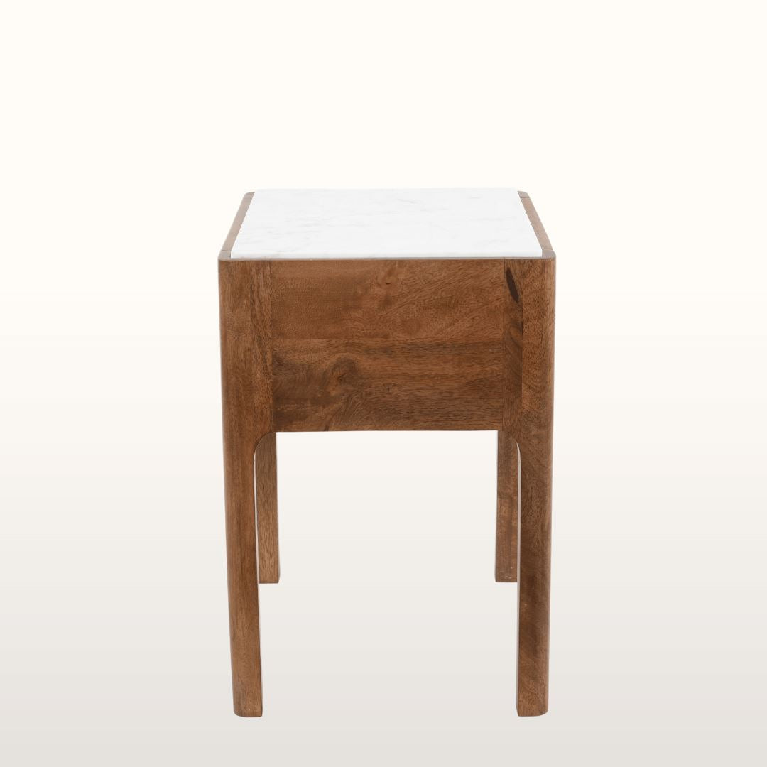 Elevate your living space with this beautifully designed contemporary side table. Its warm wooden frame in an attractive honey tone is complemented by rounded corners that combine to give a polished finish. The sleek marble top adds an elegant touch, while the generous drawer provides ample storage. Whether used as a nightstand or side table, this piece brings both style and functionality to any room. Perfect as a statement piece in a larger space or as an upscale addition to a modern home.