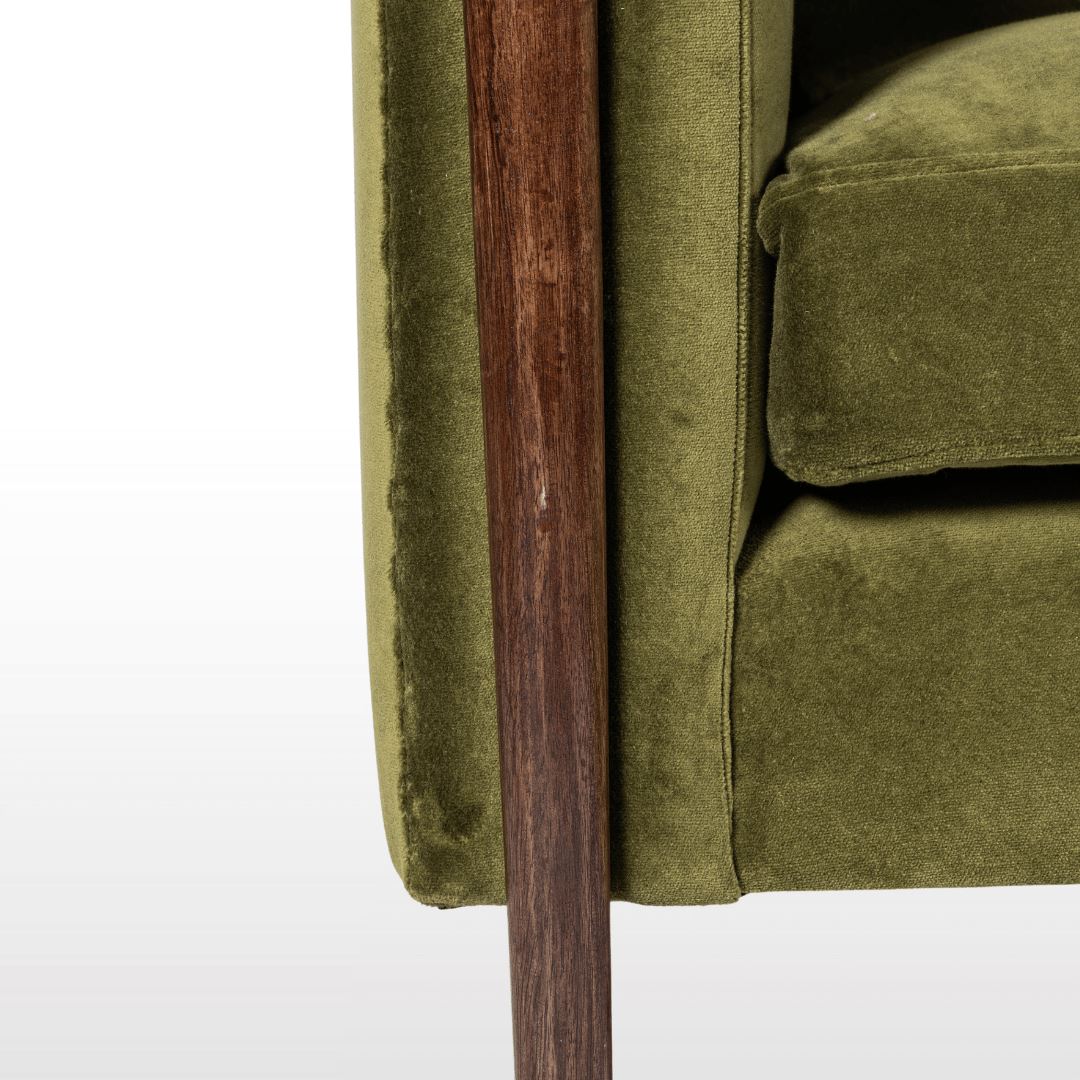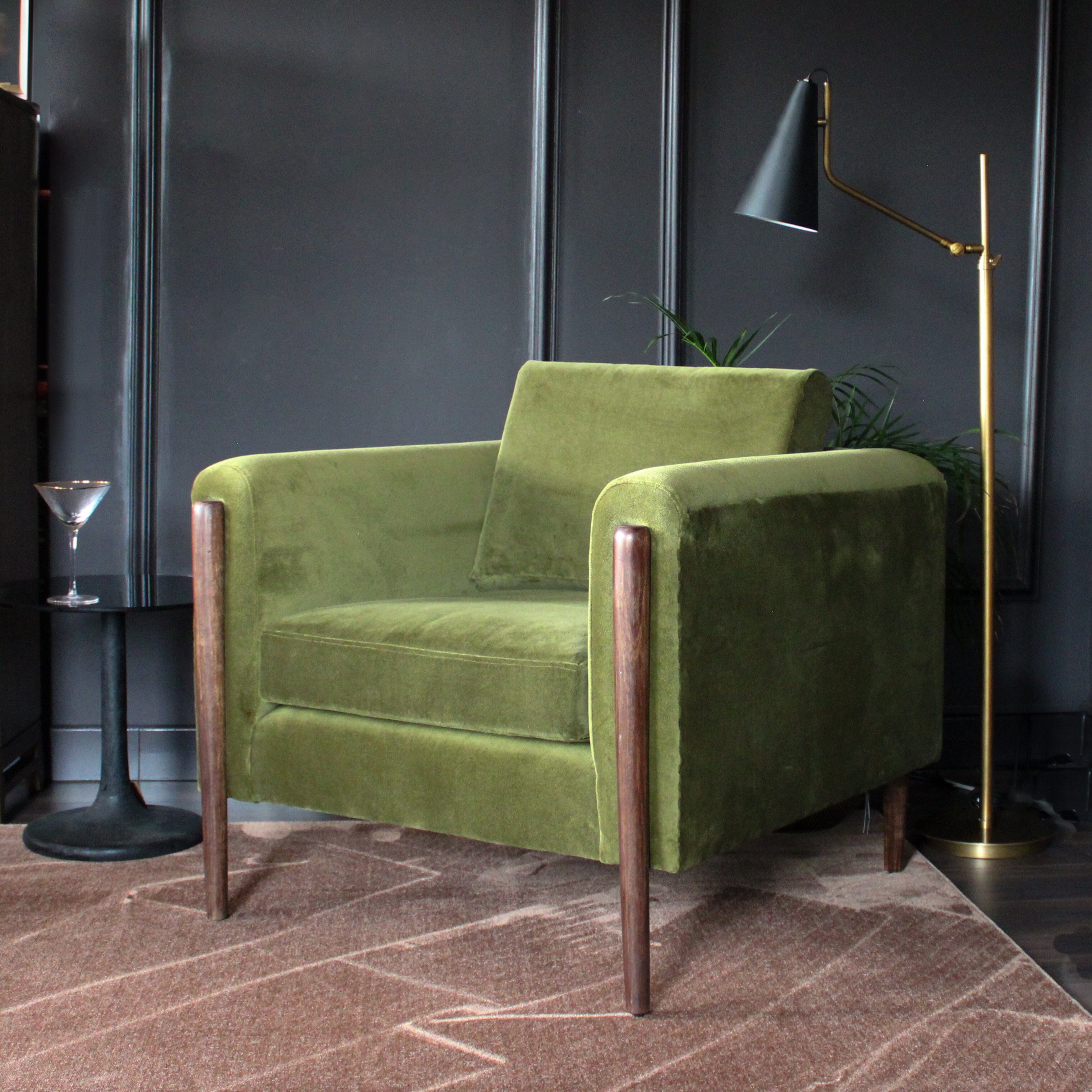 We have always had a strong love for the Mad Men aesthetic and we also love a comfortable green velvet armchair, so what's better than combining all our loves into one gorgeous lush piece of furniture?!?  This terrific armchair has it all going on.  We've paired a rich green velvet with thick medium density cushions to produce a deep and comfortable seat.  The green velvet is perfectly complemented with lovely dark wood legs that run down the front of the seat giving the effect that the chair is almost floating - just like our hero Mies Van Der Rohe designed his buildings!