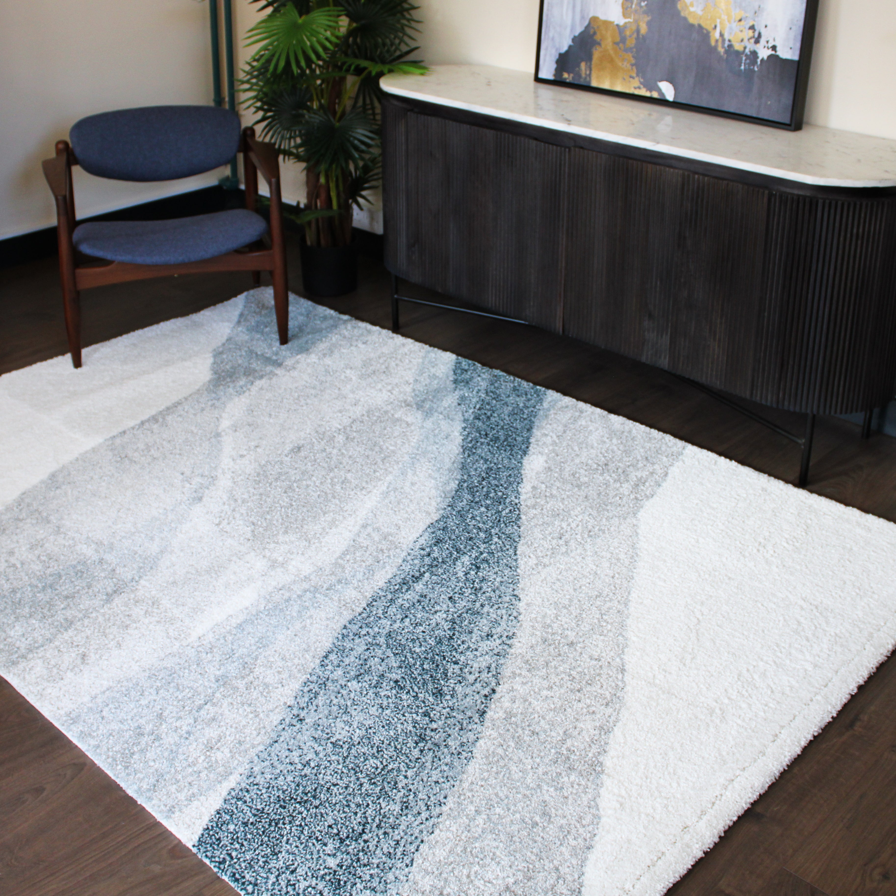 This Modern Abstract Shag Rug is a lush option for bringing a big swath of comfort to your floors. Coming in three generous sizes, this rug is ideal for large floor areas that need character, comfort and colour. We love the abstract and ethereal pattern that waves across the rug in shades of petrol, blue and grey, perfect for adding a splash of colour while maintaining a bright and minimalist look. It's thick pile is made from an easy to clean polypropylene with a woven jute base which creates grip to most floors.