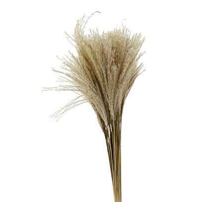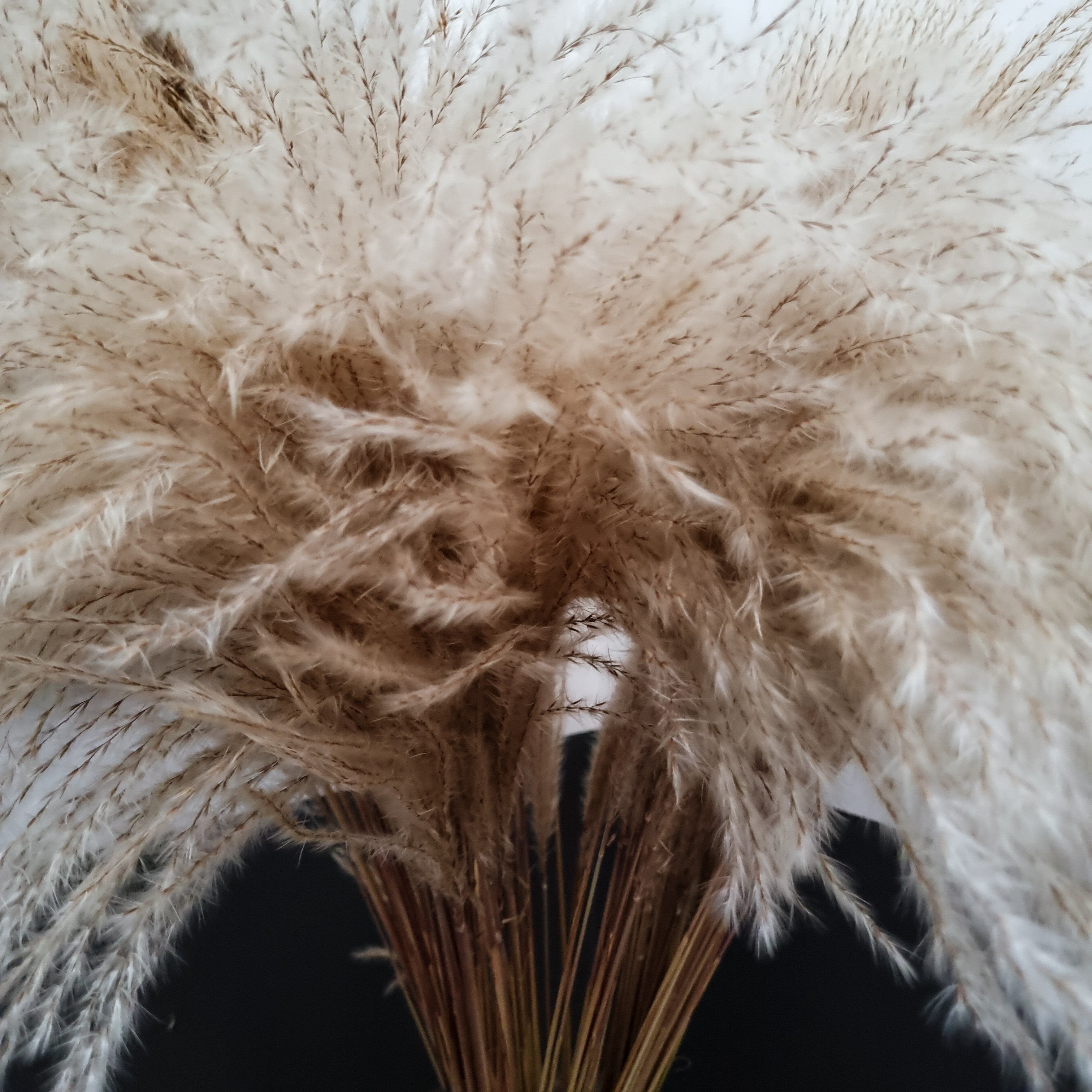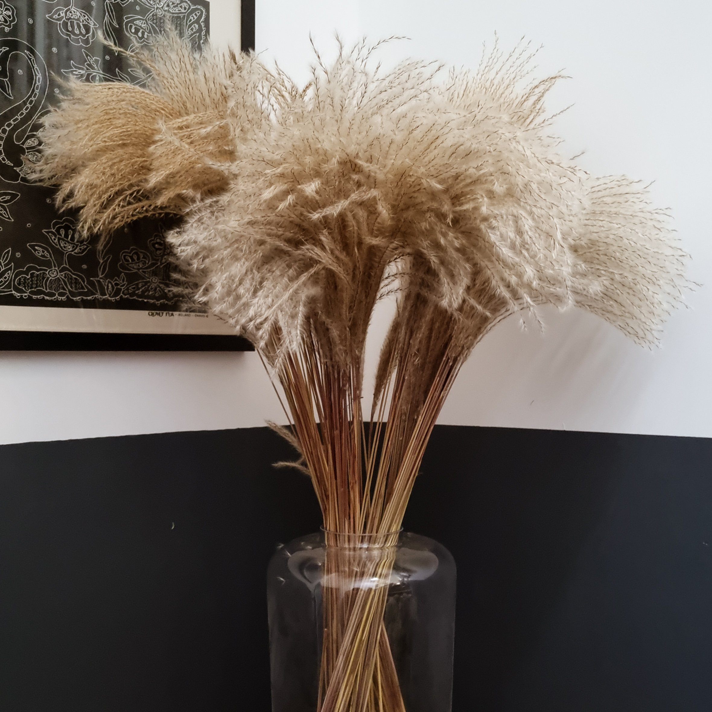 This is a very tall bunch of natural pampas that naturally falls to create a glossy textural display.  Each bunch contains several branches tied together.  In our photo we have placed 4 bunches in one of our large glass vases which produces a very tall and eye catching display.  If you require less height, the stems can be cut or broken at the bottom to suit your vase.