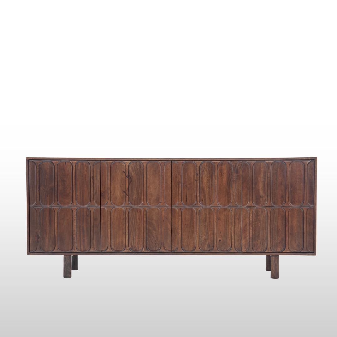 The Newman sideboard is a large and imposing sideboard with real gravitas and presence.  We designed this stunning piece to give hallways and living rooms superb presence and instant elegance.  At 180cm width, this generous sideboard features a beautifully carved set of four doors that are mounted on inset circular legs.  A true design masterpiece which takes notes from the striking Brutalist era of mid century design and adds some modern updates.  It takes it's name from the Newman Arts building at University College Dublin which is Ireland's most impressive development of strong mid century architecture.