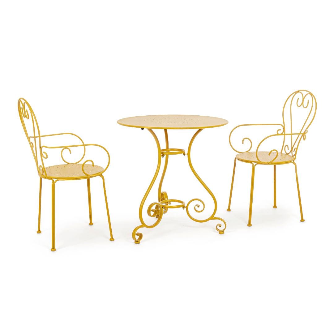 Ochre is one of those colours that looks exceptionally good in the garden and the colour of this fabulous bistro set is a match made in heaven. We absolutely love the whimsical and botanically inspired design which make them super pretty for a little coffee corner in the garden. The bistro set consists of one table and 2 chairs.