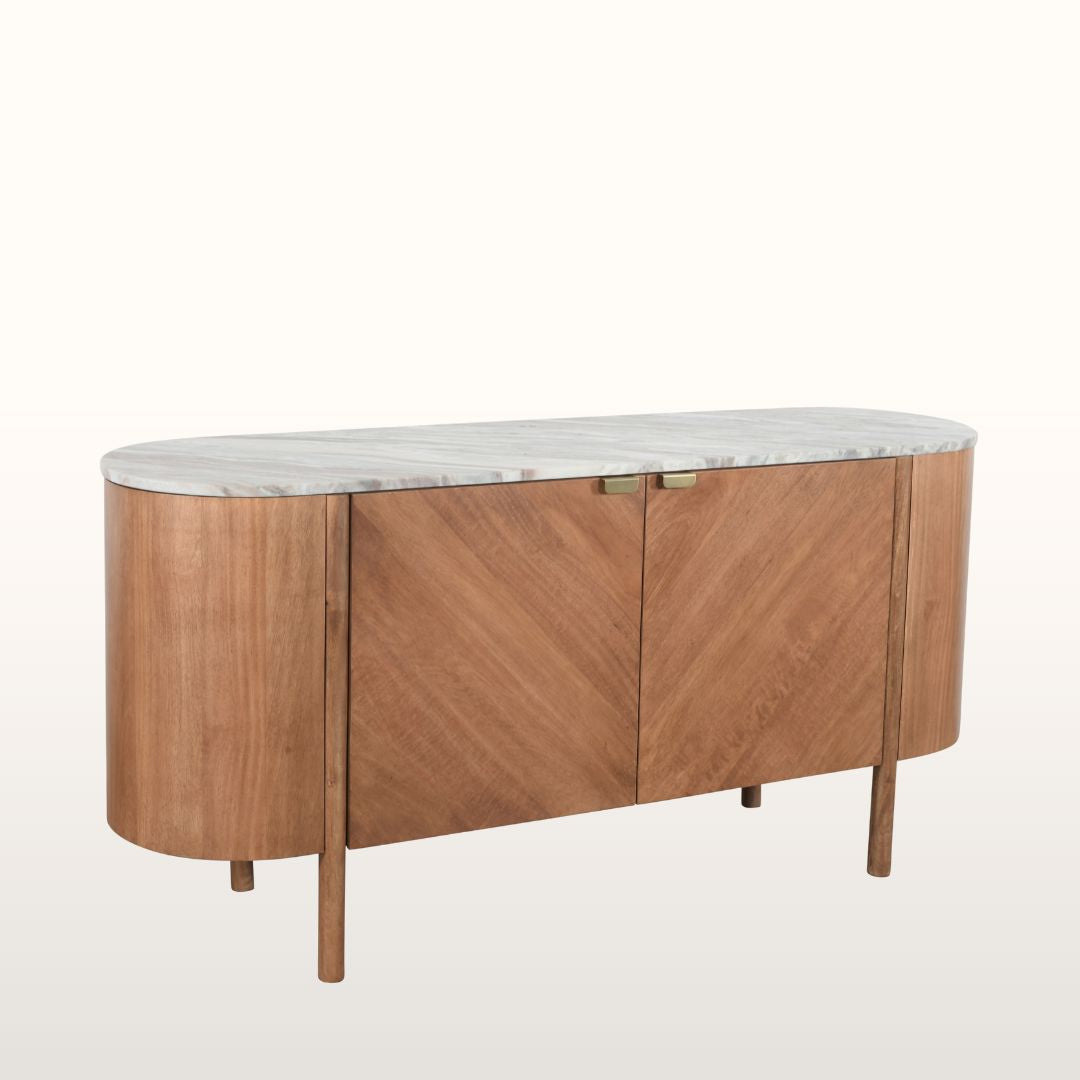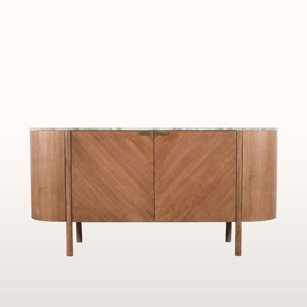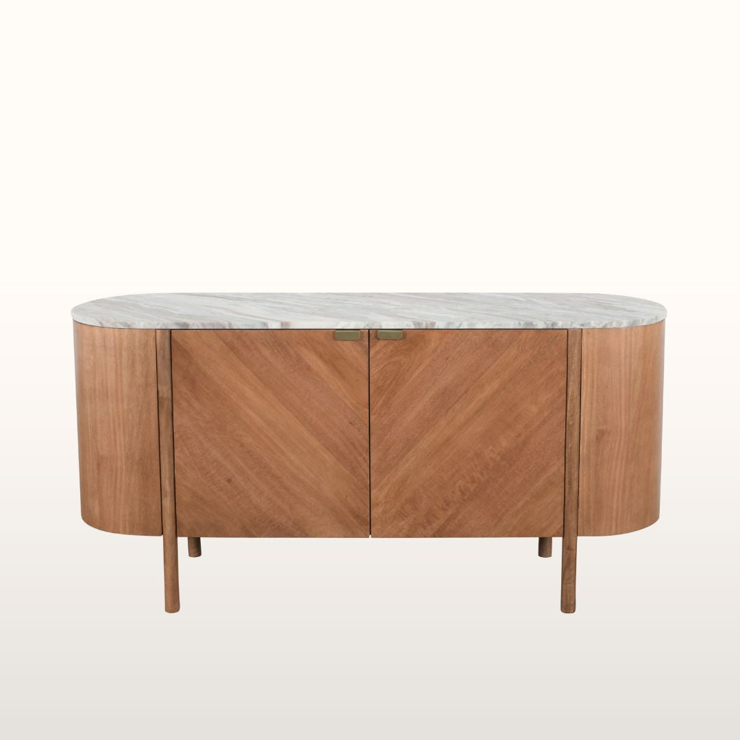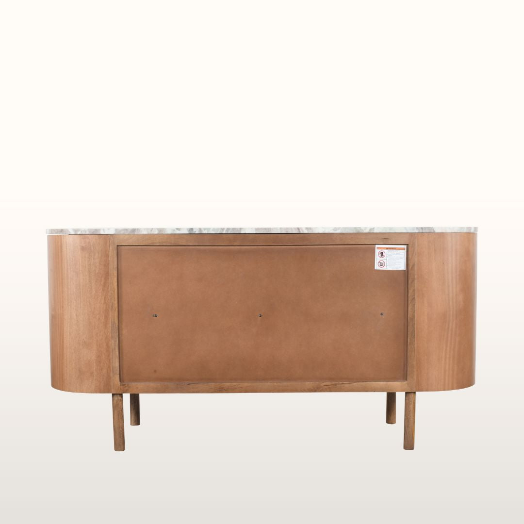 The Sunburst Sideboard with Toronto Marble is a beautiful piece designed for discerning interiors.  It is the little sister of the Sunburst Sideboard in 200cm and has all the same elegance and style. This sideboard commands attention with its sunburst-detailed doors and gracefully curved legs that create a striking floating effect. The luxurious Toronto marble top adds refined sophistication, while thoughtful proportions and meticulous craftsmanship elevate every angle. Inside, a generous single shelf maximises storage without compromising the streamlined silhouette. Perfect for those seeking a focal point that balances beauty with purpose.