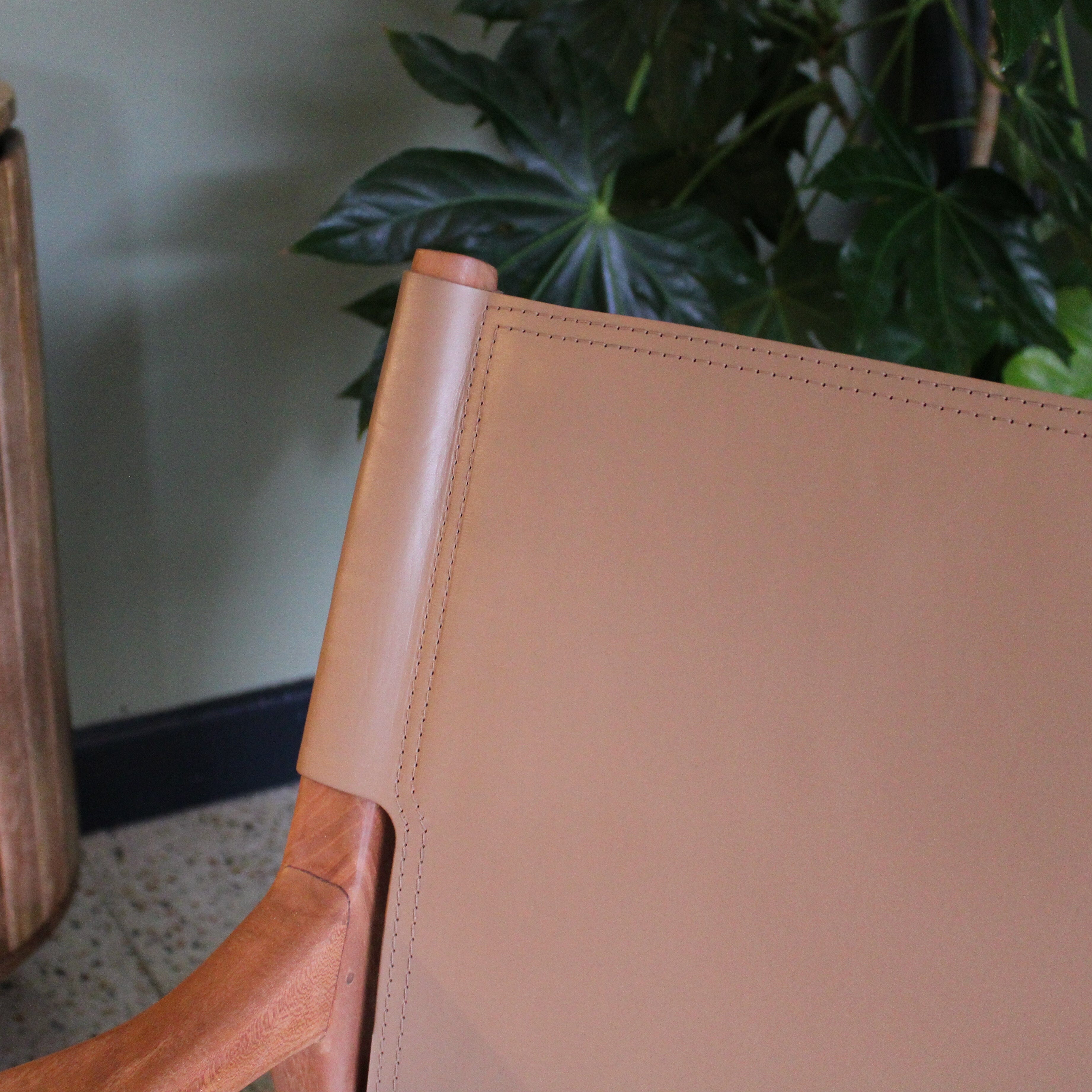 These chairs are really something special.  They have an unrivalled elegance of shape which is perfectly completed by the use of beautiful materials.  The teak frame is warm with a gracious grain running through it that lends itself without question to the beautiful bent wood arms and fine detailing.  To complement this is a taut yet comfortable leather seat suspended perfectly between the arms which will age beautifully in time to develop a rich patina.  This is a chair that would look fabulous as a pair opposite a deep Chelsea Sofa.