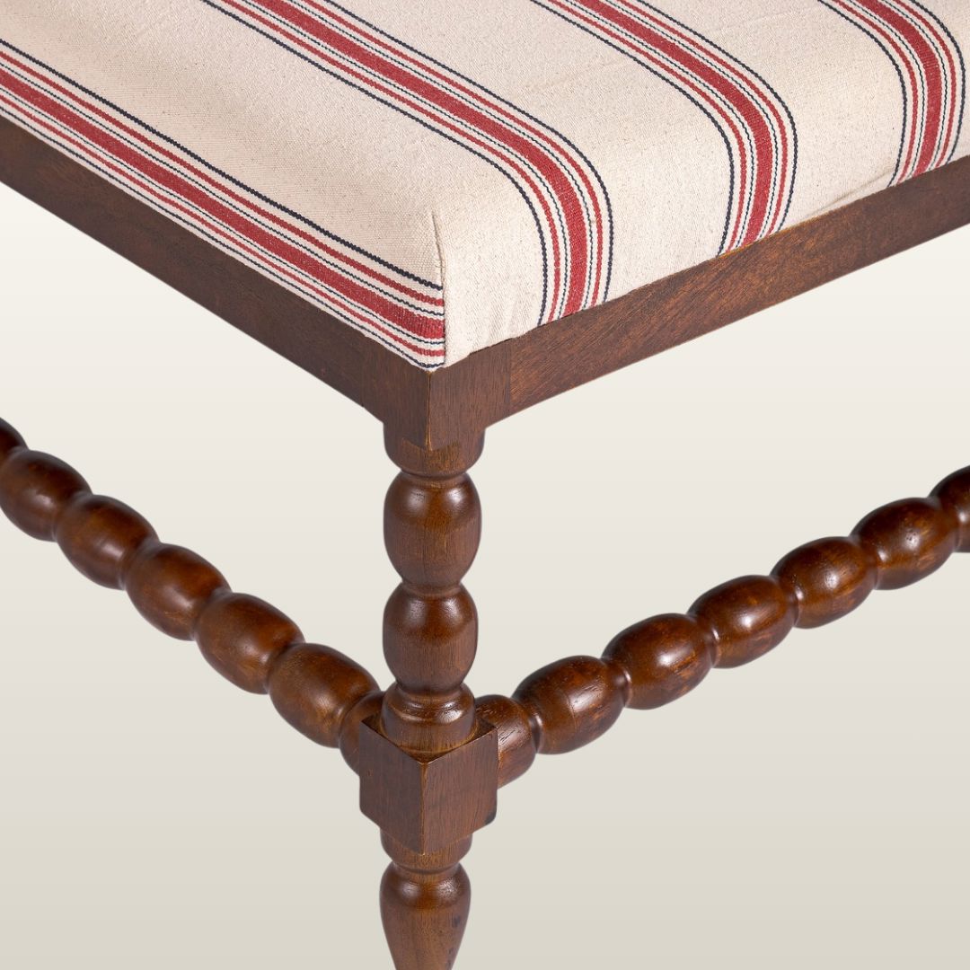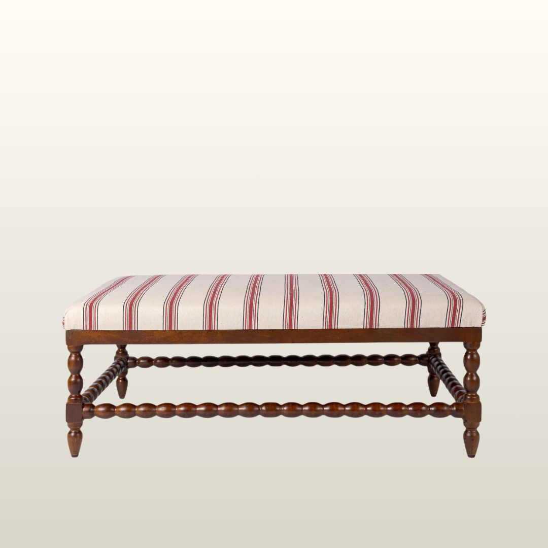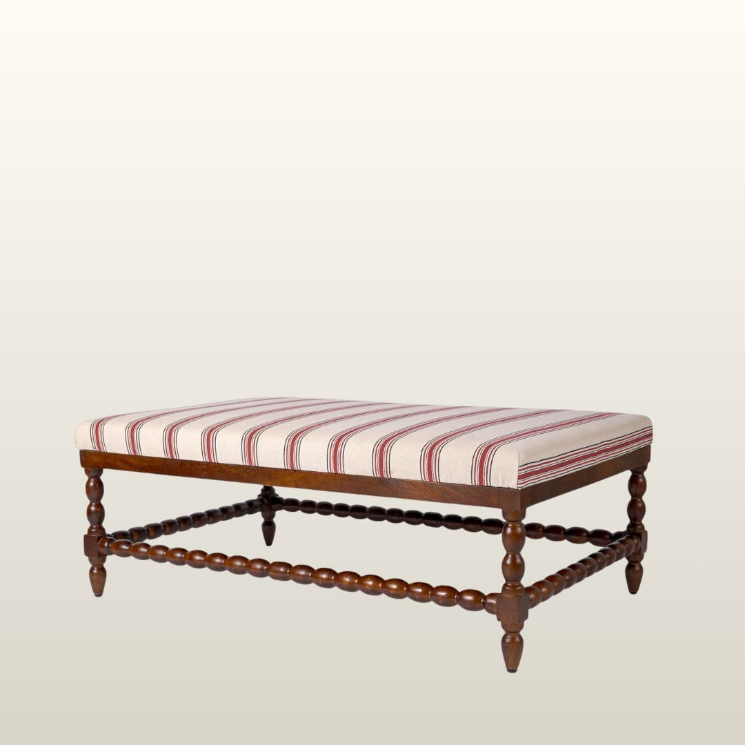 The substantial Tetbury Ottoman brings together form and function with understated elegance. Upholstered in ticking tape red stripe, it pairs beautifully with large three-seater sofas whilst standing as a striking statement piece. The mid-brown wood bobbin legs echo Northern European design traditions, adding warmth and character to any interior. Versatile by nature, it serves as both a generous footrest and impromptu coffee table, whilst the included wooden trays enhance its practicality. A thoughtfully designed piece that balances style with everyday utility.