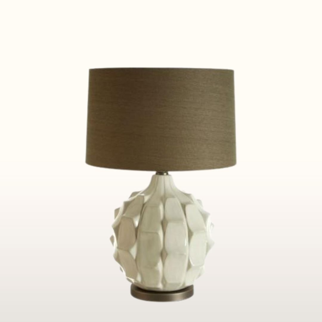 Oh yes, now this is a large and deeply structural table lamp that just blows us away! We love the strikingly designed ceramic body in white matte and the large rectangular indents that make it so supremely tactile. The large base is topped with a refined light brown linen shade and the high contrast makes it a timeless yet eye catching piece. A real keeper as you will be able to change this shade through the years to match your decor. This lamp would look amazing as a large bedside or in a big living room.
