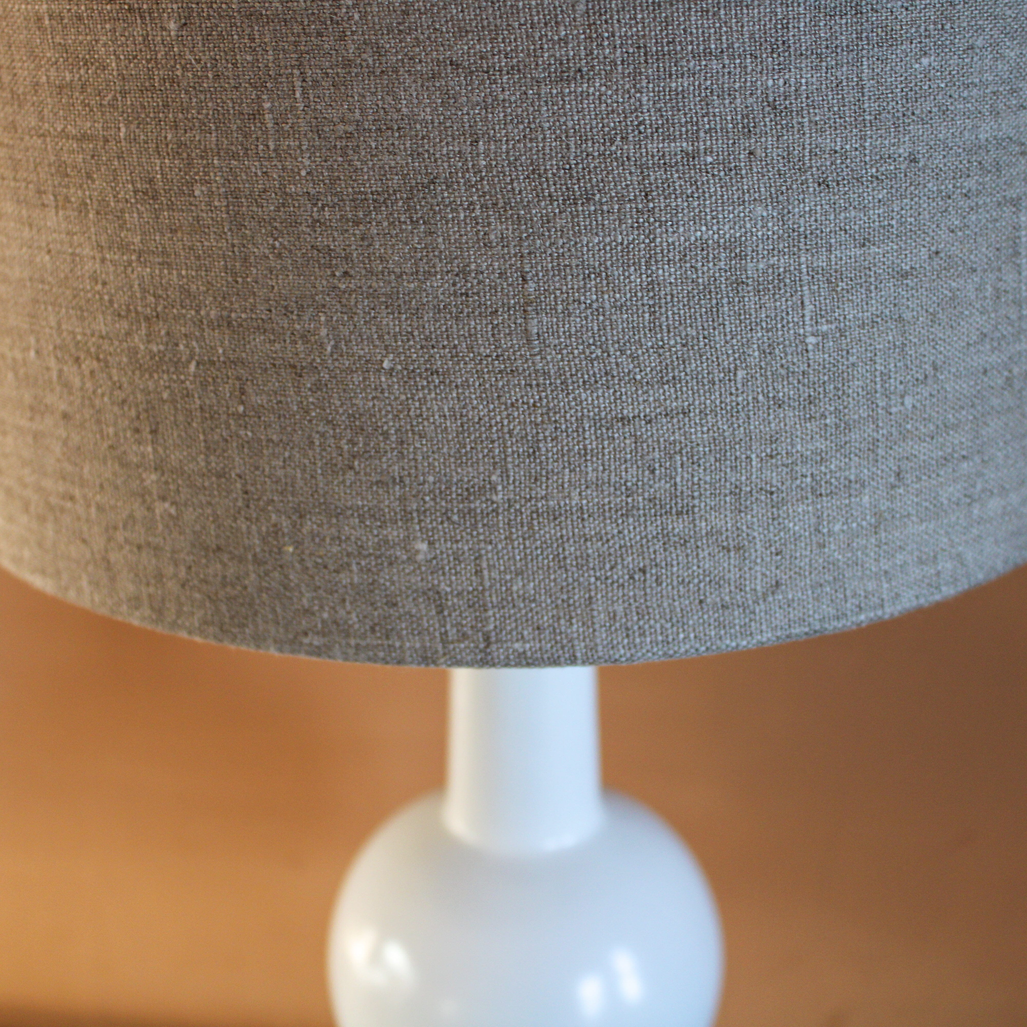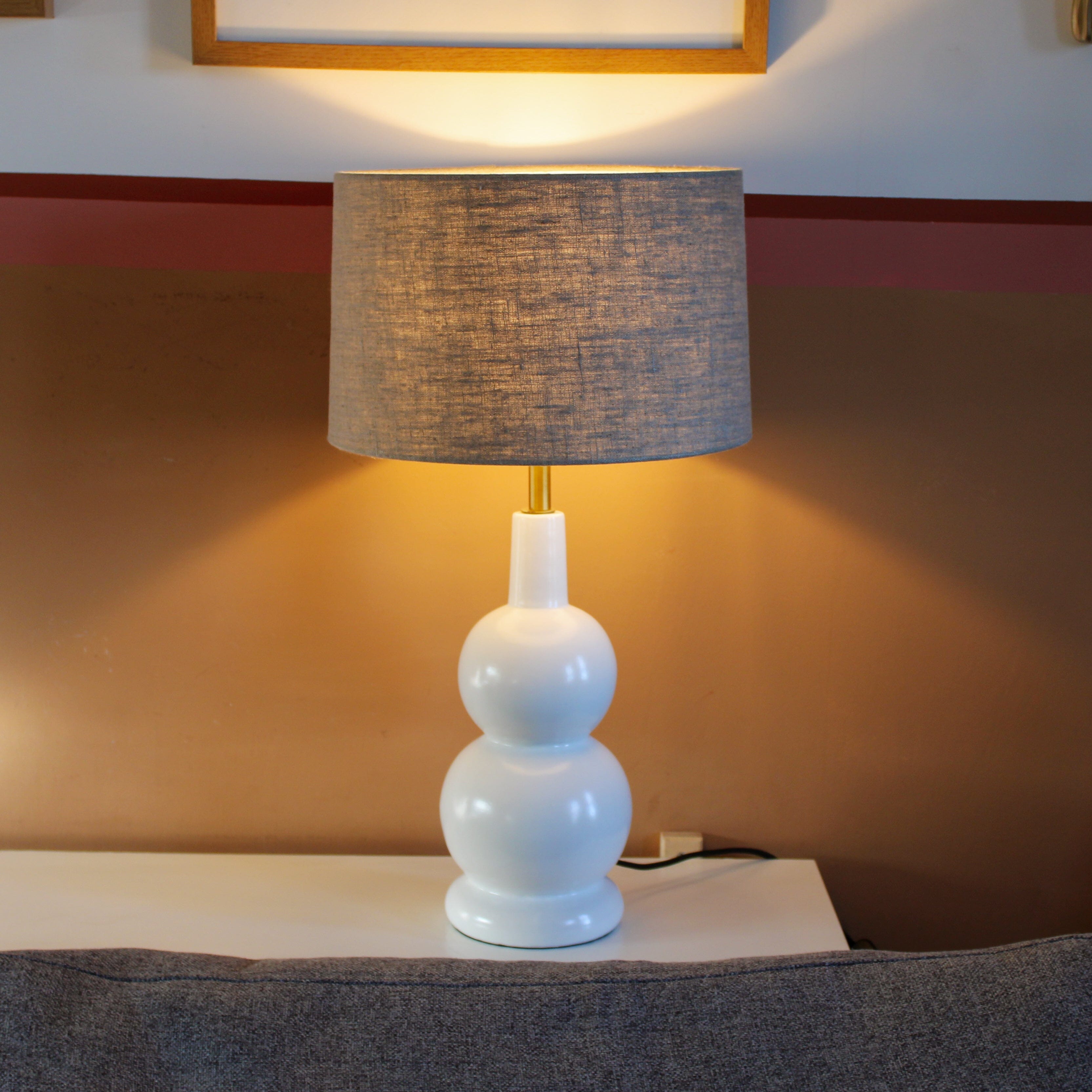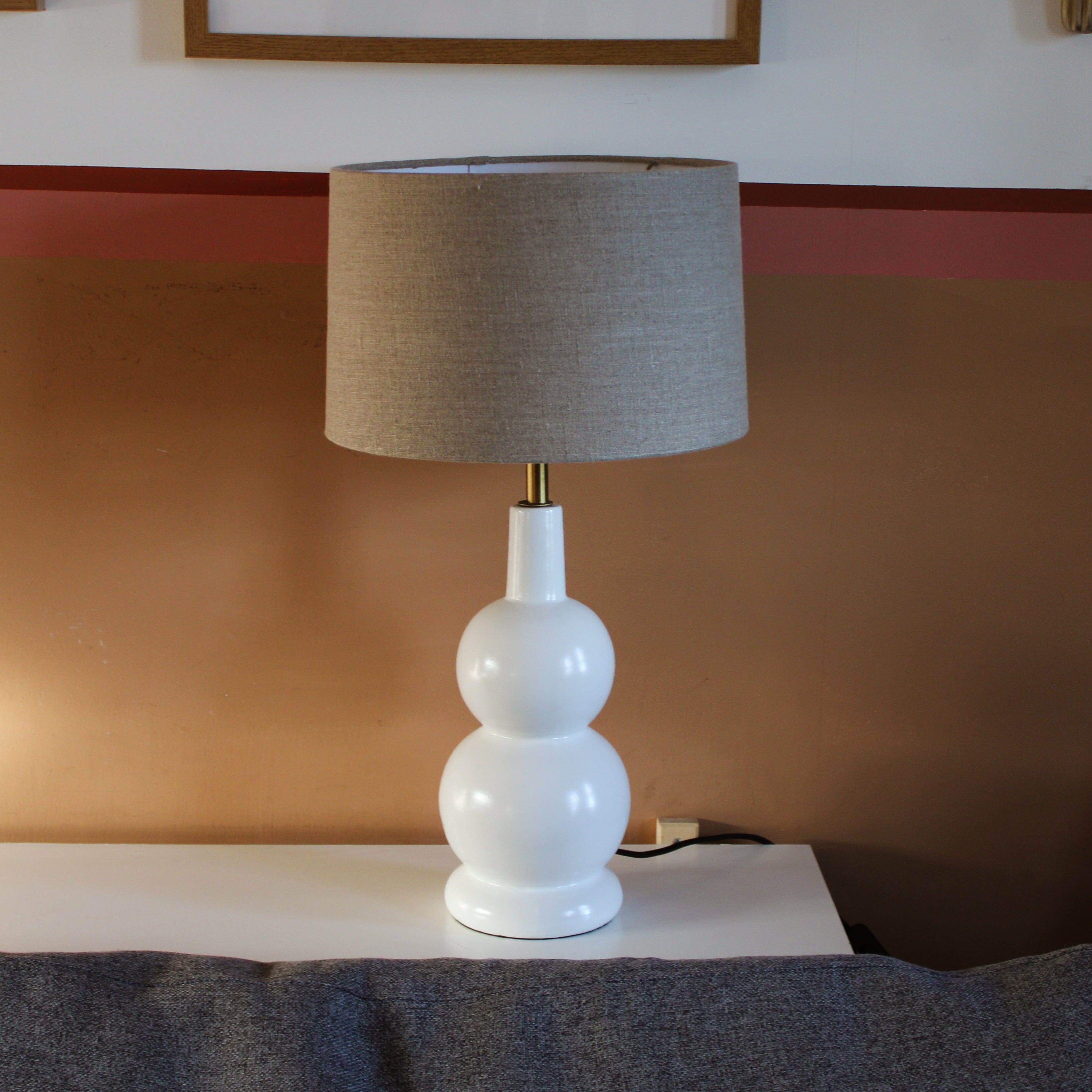 This is a sweet and simple table lamp. We love it's minimalist white base in a classic curved shape paired with the gorgeous linen drum shade. It is a mid sized lamp which makes it ideal for most areas. We think that it works particularly well in a living space as it gives off soft warm light and will fit neatly on surfaces as small as 30cm in depth. The combination of base and shade colour makes this the perfect lamp to add some contrast against a warm paint colour.