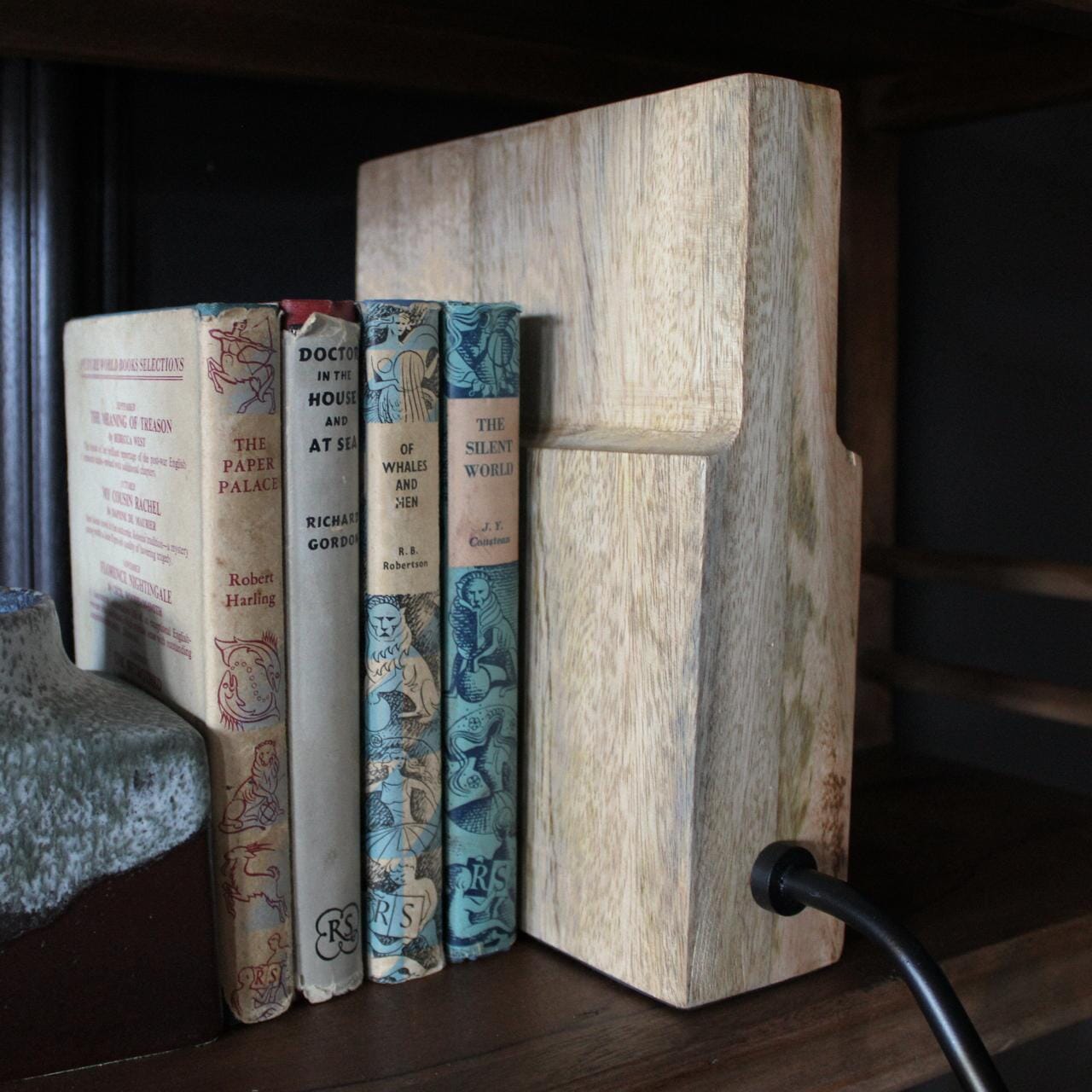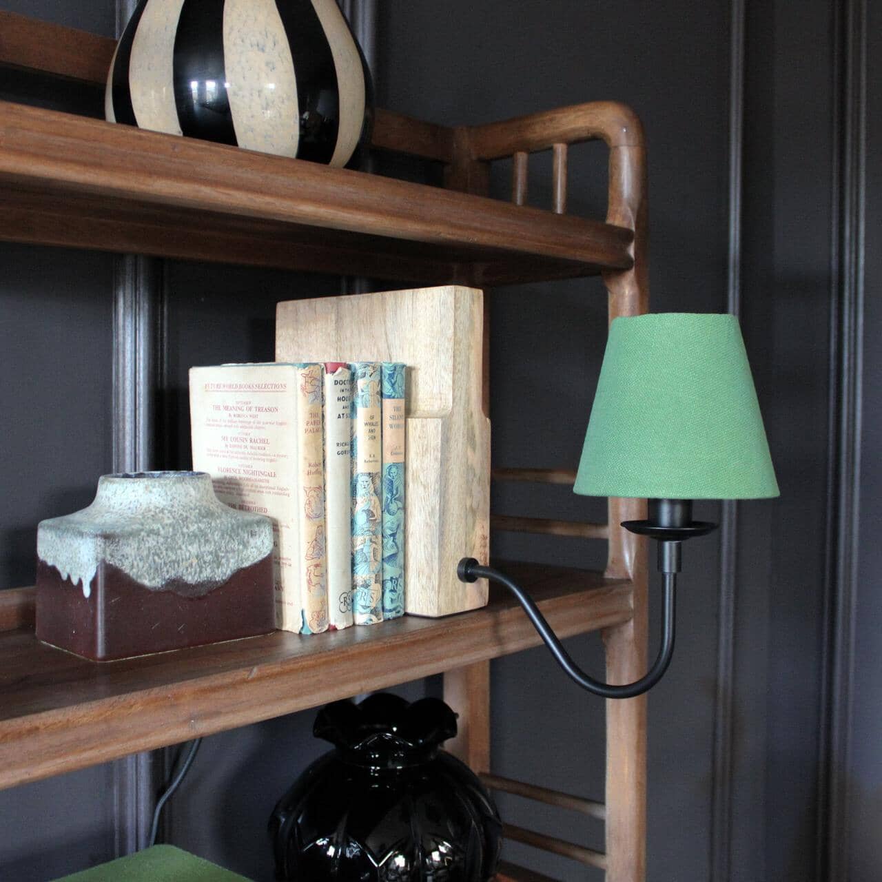 This is a bookshelf lamp and it's designed for to give light where you thought you couldn't get light!  We designed these lights in Dublin following so many conversations about how to getter better illumination around bookshelves.  These gorgeous pieces will slot in between your books, resting on the shelf and plug in to the wall behind.  The resting block in this one is wood and the green shade is supported by an elegantly curved black stem.  Super pretty and not too big, these are such a lovely decorative solution to a long standing problem!  Now you will be able to see all those book titles in glorious light and also add a soft warm glow to a dark space.